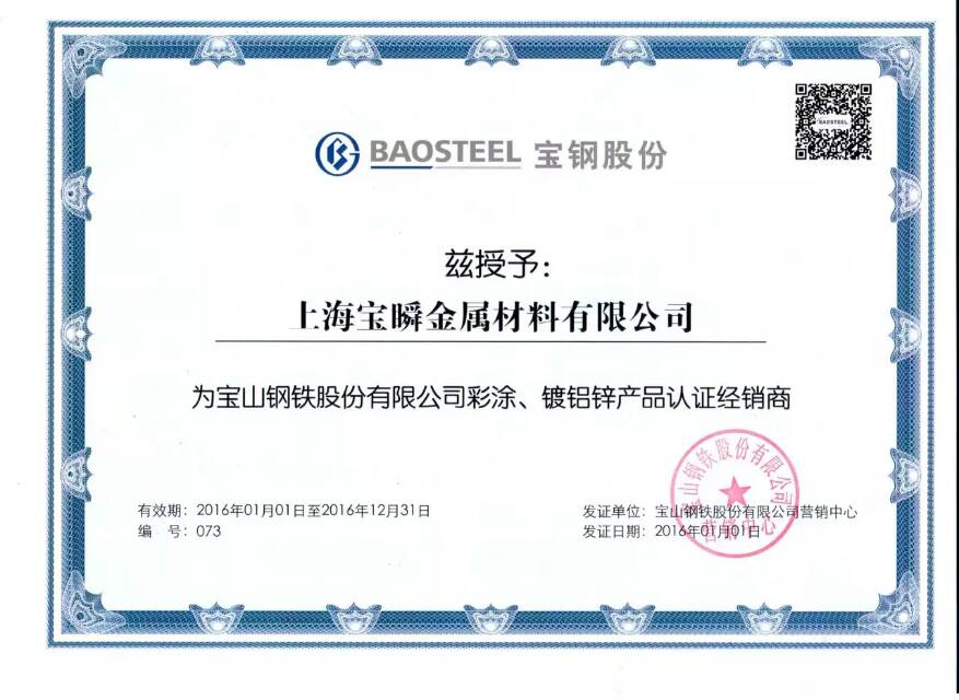 2016年上海宝钢代理证书