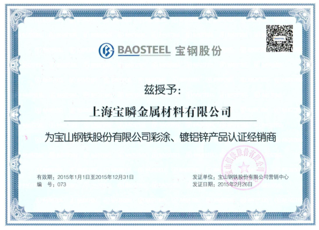 2015年上海宝钢代理证书