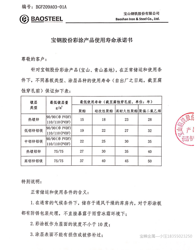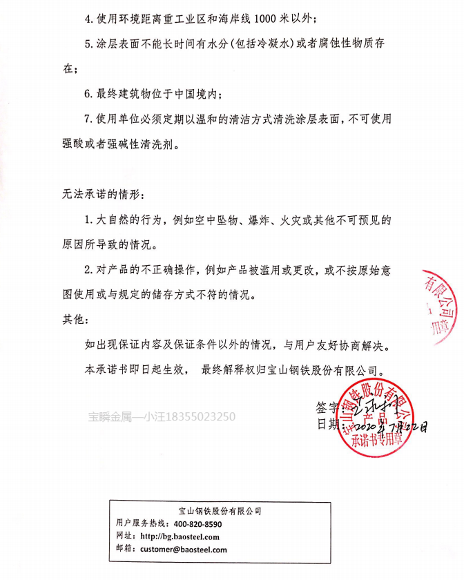 宝钢股份彩涂产品使用寿命承诺书